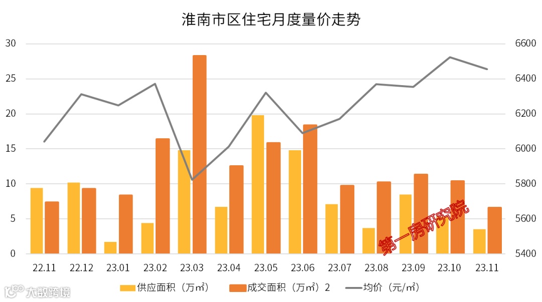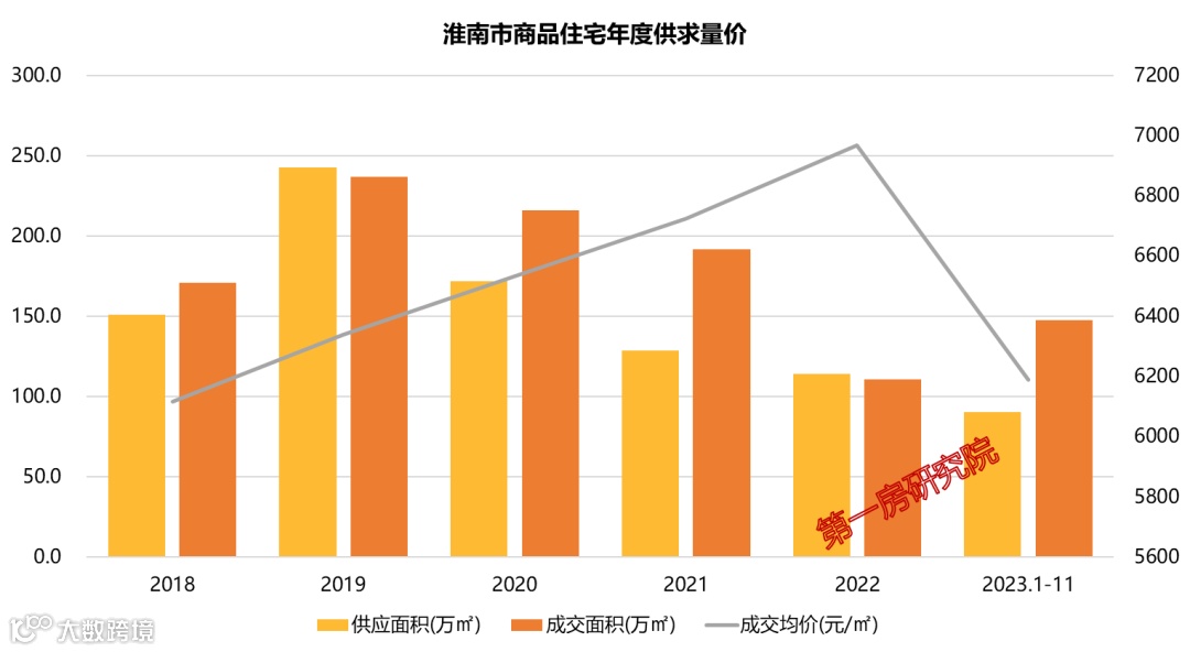 近5年淮南市住宅年均供应161.8万㎡,年均成交185.4万㎡ ,需求大于供应,平均售价在6499元/㎡。2023年1-11月淮南住宅累计供应90.3万㎡,成交147.8㎡,处于去库存状态,成交均价为6189元/ ㎡。