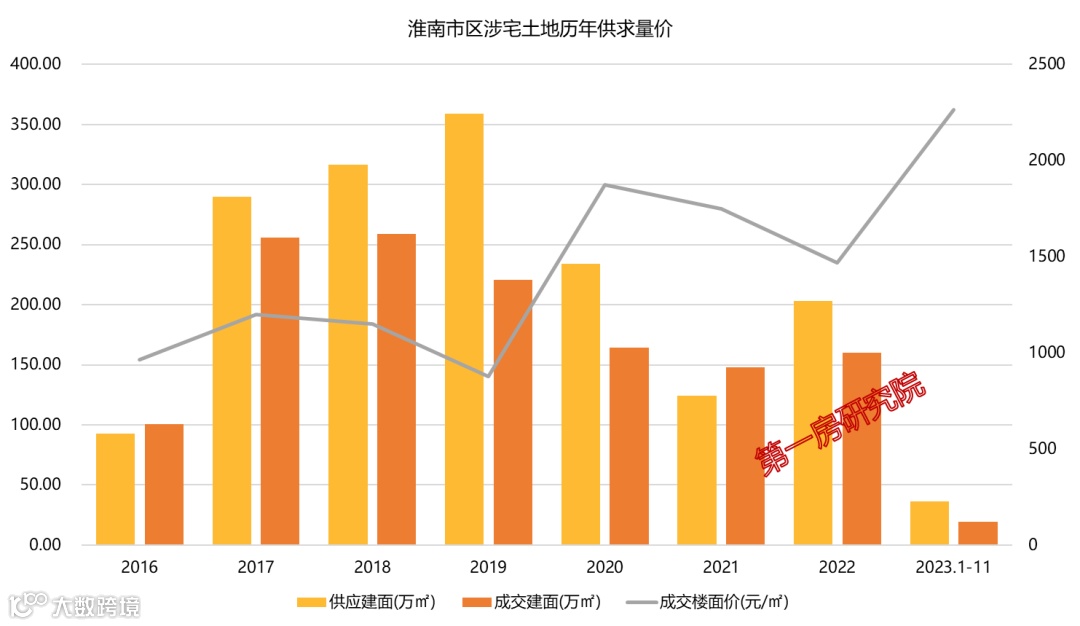 近7年淮南市区涉宅用地供应建面约231万㎡,成交建面均186万㎡,供应成交率为80.5%,供应大于需求,成交楼面价整体呈上涨趋势。2023年1-11月淮南涉宅供应36.6万㎡,成交19.3万㎡,楼面价达到了2264元/㎡,同比增长54%。