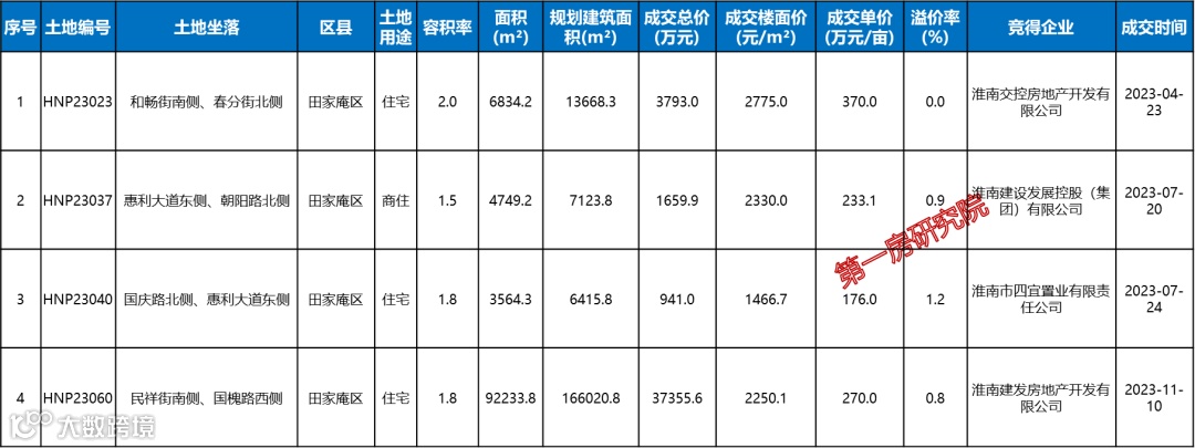 2023年1-11月,淮南市累计成交4宗地块,面积为161.1亩。其中两宗地位于老城区,但面积均较小,合计面积为12.5亩;另外两宗地则位于山南高新区,面积达到了148.6亩。