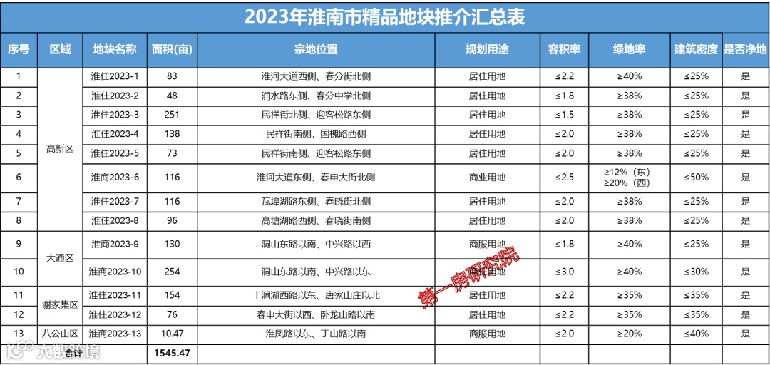今年4月的时候,淮南市政府曾举办过“楚风汉韵 山水淮南” ——2023年淮南市优质地块土地推介会。会上,淮南市共推介13宗优质商住地块,面积超1500亩。地块主要分布在高新区(8宗地块,共计921亩)、大通区(2宗地块,共计384亩)、谢家集区(2宗地块,共计230亩)以及一宗八公山区的10.47亩商业用地。