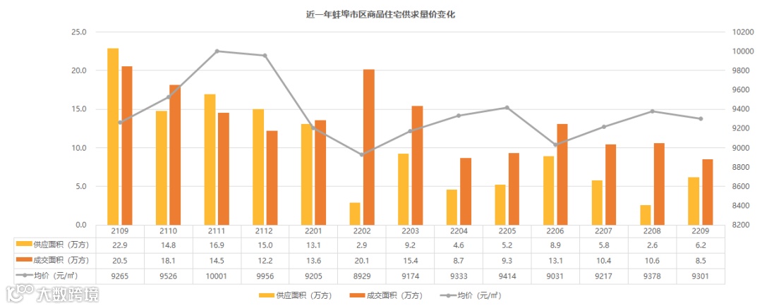 蚌埠市区2022年9月份:供应6.2万方,环比上涨136%,同比下降73.1%,成交8.5万方,环比下降19.5%,同比下降58.4%,均价9301元/㎡,环比下降0.8%,同比上涨0.4%。