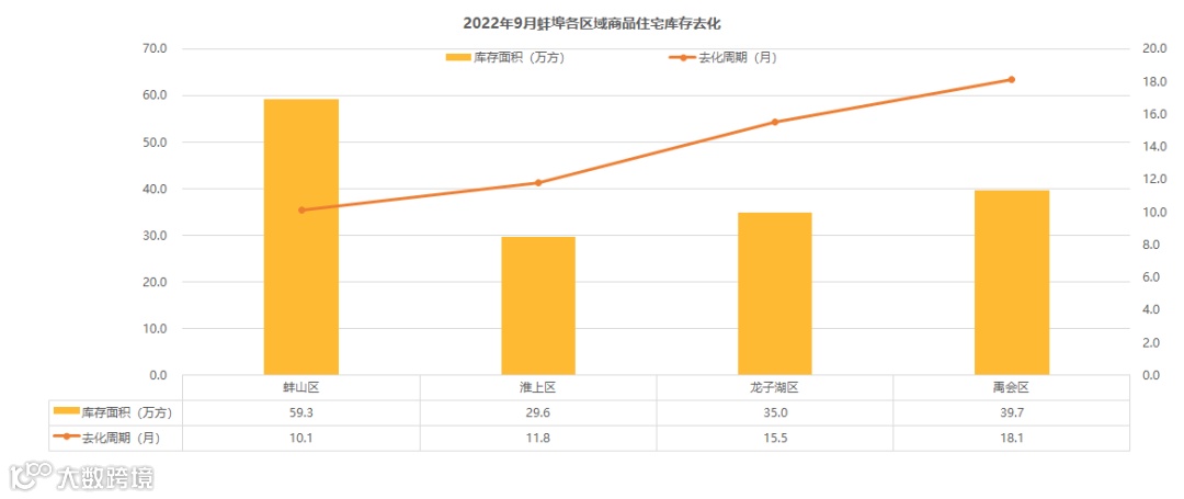 截止到9月底,蚌埠全市住宅库存面积约163.7万㎡,整体去化周期约12.7个月,其中蚌山区库存量最高,达到59.3万㎡,而禹会区去化周期最长,长达约18.1个月。虽然淮上区的库存在各个区中数量最低,但也正是因为淮上区项目偏少,房企对于这个区域的抗风险性一直持观望态度。