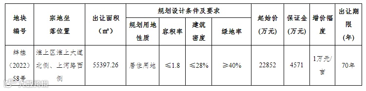 2022年10月14日,蚌埠出让一宗优质地块,编号蚌挂(2022)58号,保证金截止2022年11月2日17时,拍卖时间为2022年11月4日下午15时。蚌埠市自然资源和规划局将根据申请截止时的申请情况,确定地块公开出让的具体方式(挂牌或拍卖),并告知所有申请人。凡符合竞买条件并取得竞买资格的竞买人达到2家以上(含2家)的地块,按拍卖方式出让,竞买人不足2家的地块,按挂牌方式出让。