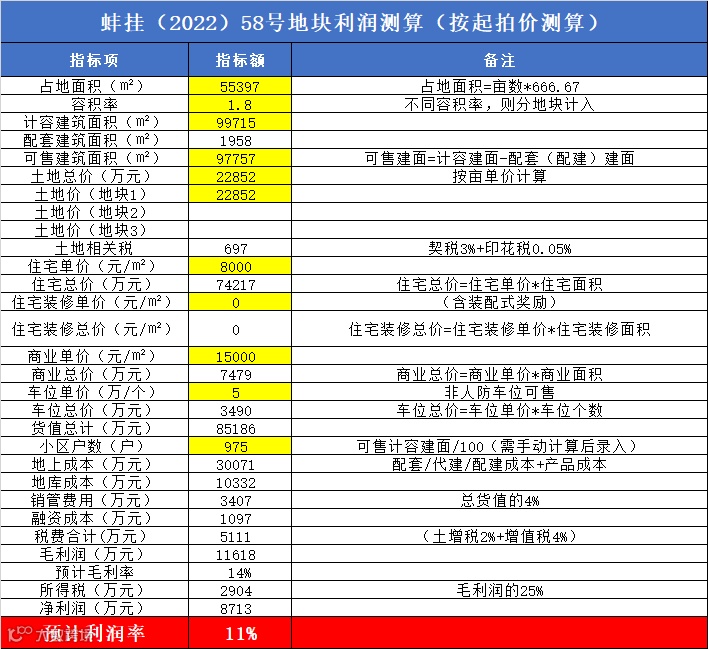 结合地块周边项目售价情况,按照地块起拍价测算,蚌挂(2022)58号地块利润率约11%,起拍价下的利润较高。