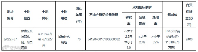 [2022]-37号宗地要求:(1)竞买人可以是自然人、法人和其他组织。(2)依据颍泉区政府函,颍泉区政府以5600元/平方米的综合价格对该宗地40000平方米的住宅计容建筑面积予以回购用于安置,地下车库及相关设施无偿提供给颍泉区政府指定单位,颍泉区政府负责提供回购安置房套型。回购付款方式详见〔2022〕-37号地块安置房回购协议。此条款由颍泉区政府负责监督落实。