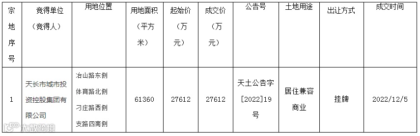 2022年12月5日,天长市自然资源和规划局在市公共资源交易中心公开出让1宗商住用地,成交1宗。