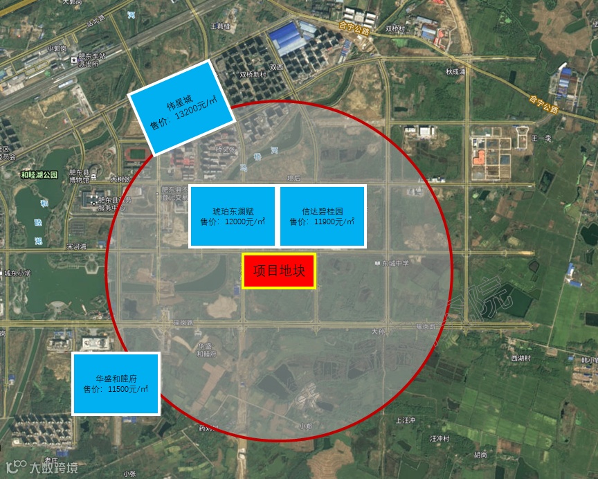目前在亿达地块所在的和睦湖板块内主要在售项目有四个,其中琥珀东澜赋、信达碧桂园,这两项目就在地块的正北侧,在售价格12000元/㎡左右,月均去化20-30套;距离稍远一些的伟星城价格稍贵一些,价格13200元/㎡,去化与前两项目持平,而华盛和睦府价格稍微便宜些,均价11500元/㎡。