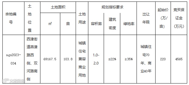 ngs2023-034号地块位于西津街道燕津路西侧、双河路南侧,出让面积69167.5平方米。该地块的建设要求需严格按照宗地规划设计条件执行(详见出让文本)。