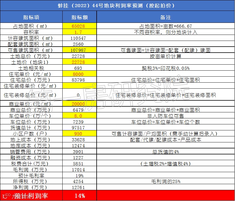 结合地块周边项目售价情况,考虑到目标地块位置更靠近核心城区,按照地块起拍价测算,住宅按照均价8000元/㎡,商业按照2万元/㎡,车位8万/个,(2022)44号地块利润率约14%,利润空间较大。