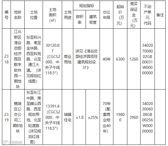 (四)保证金处置方式:2318号宗地竞得人签订《国有建设用地使用权出让合同》后,已缴付的竞买保证金1260万元转作履行合同定金(不计息),合同履行后,转作土地出让金(不计息);2319号宗地竞得人签订《国有建设用地使用权出让合同》后,已缴付的竞买保证金3960万元转作履行合同定金(不计息),合同履行后,转作第一期土地出让金(不计息)。未成交者在拍卖结束后退还保证金(不计息)。对虽已报名登记但不参加竞买