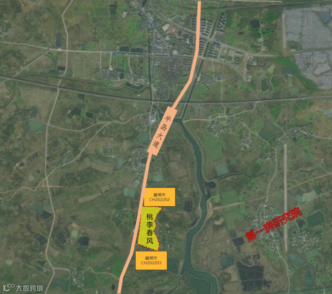 最后巢湖市出让两宗地位于炯炀镇,靠近巢湖,景观资源优渥,两宗地正好位于桃李春项目的南北方向,都被蓝城+合肥城改+巢湖半岛联合体竞得。位于北侧的巢湖市CH202202号地块最终成交价为单价303万元/亩,总价31820.31万元,而南边的巢湖市CH202203号地块,成交价为单价303万元/亩,总价9356.64万元,溢价率均为1%。