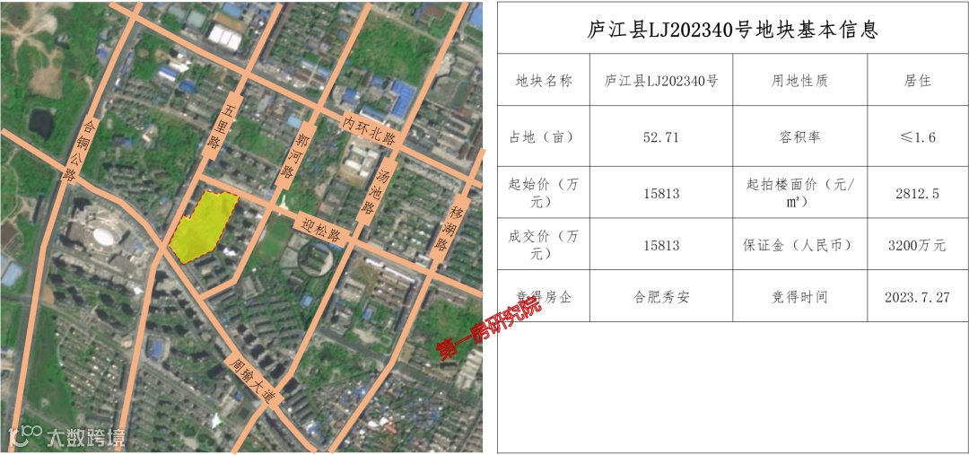 本次庐江县出让的两宗地,位于城区的庐江县LJ202340号地块,最终被合肥秀安以单价300万元/亩,总价15813万元成交。