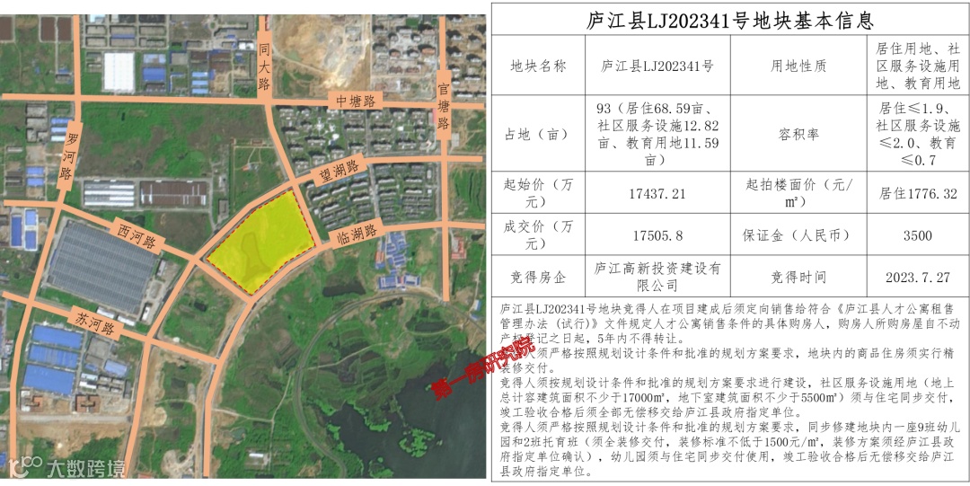 另一宗位于庐江高新区的LJ202341号地块,被庐江高新投资建设有限公司以单价226万元/亩,总价17505.8万元的价格成交。不过高新区这宗地为定向销售,并且自不动产权登记之日起,5年内不得转让。