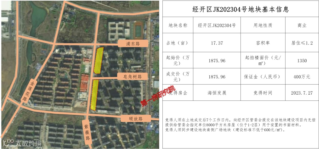本次经开区出让的2宗地,经开区JK202304号为商业地块,位于空港新城,不出意外仅一家房企报名,最终被海恒发展低溢价竞得。