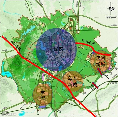 三片是滁西、滁东、滁南片区,片区之间由铁路、河流、生态绿地分隔,并由环路和城市快速道路相连;