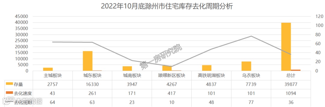 根据AI楼市数据显示,截止到2022年10月底,滁州市区已入市项目的总库存量约为39877套,其中城东板块库存压力大。按照目前各板块去化速度计算,主城、乌衣、城东板块去化周期长,城南、琅琊新区板块去化周期相对较短。