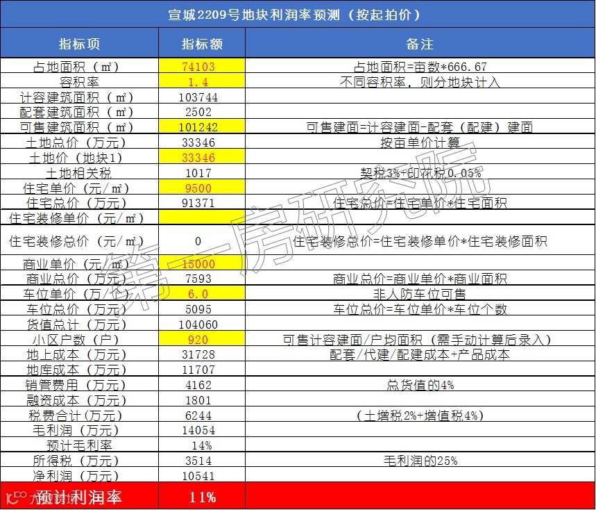 结合地块周边项目售价情况,考虑到目标地块容积率较低,适合做洋房加别墅产品的组合。按照地块起拍价测算,住宅均价按9500元/㎡,商业按15000元/㎡ ,车位按6万/个,2209号地块利润率约11%,利润空间较大。