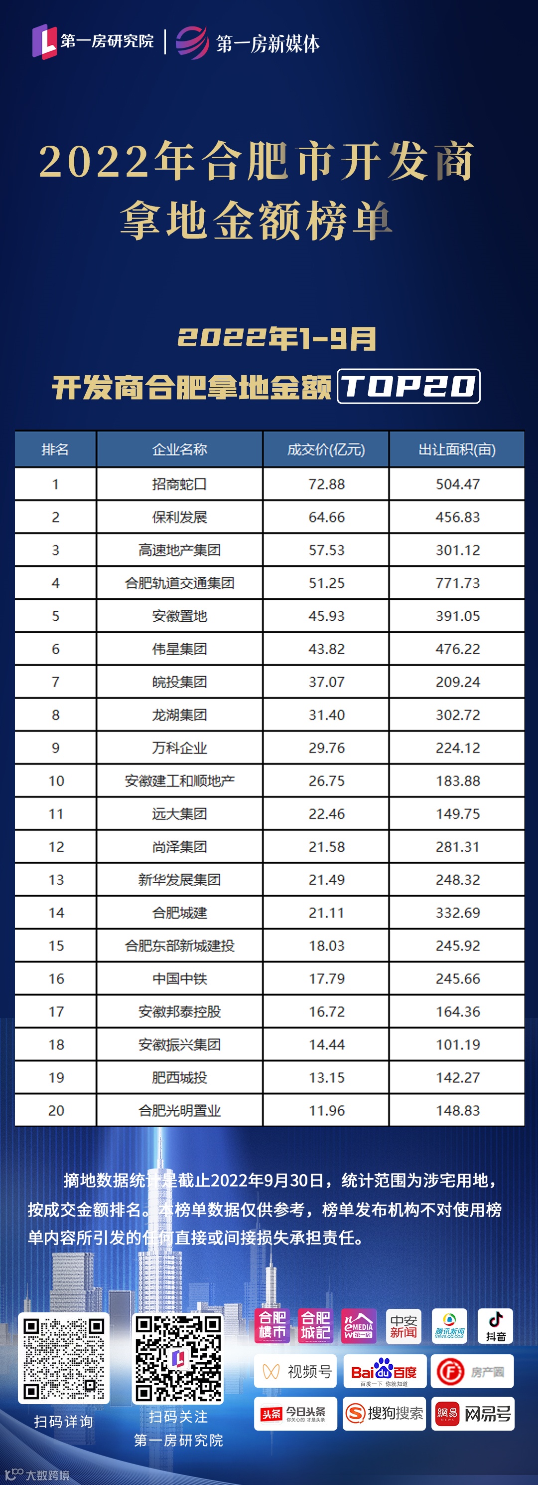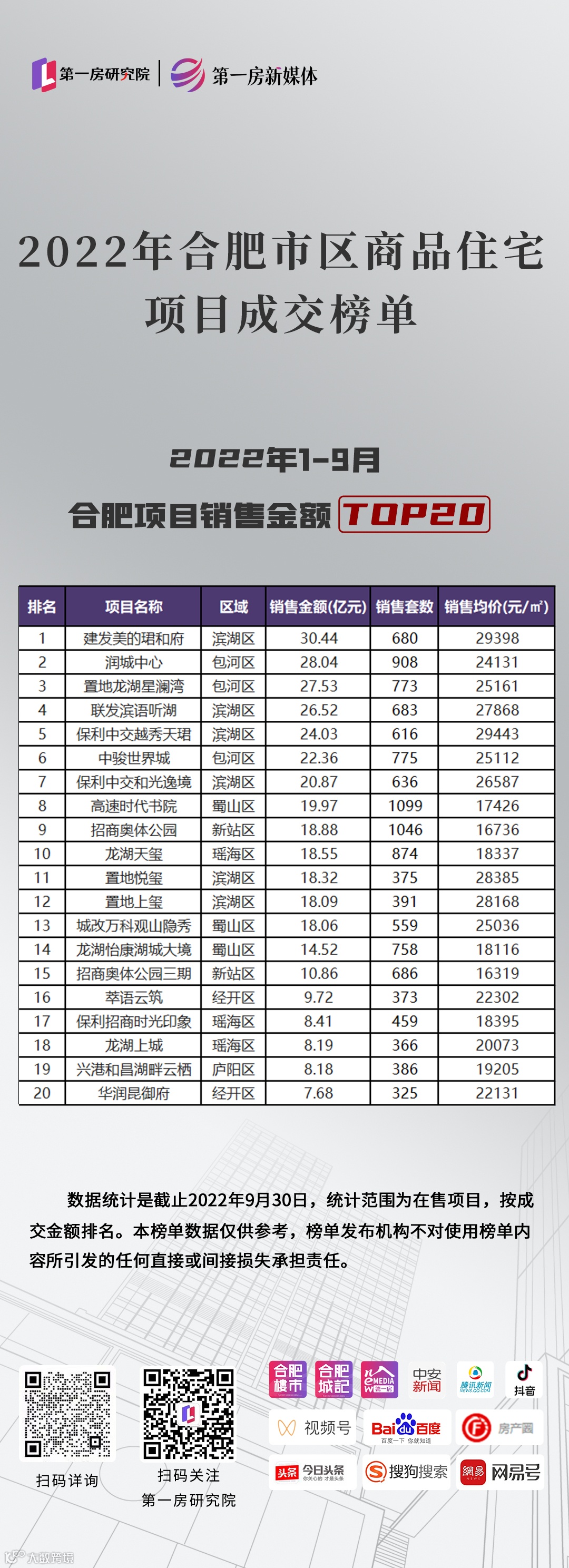 AI楼市大数据显示,合肥1-9月最新排行榜单发布,下面让我们一起来看看各区、各项目、房企TOP20情况!