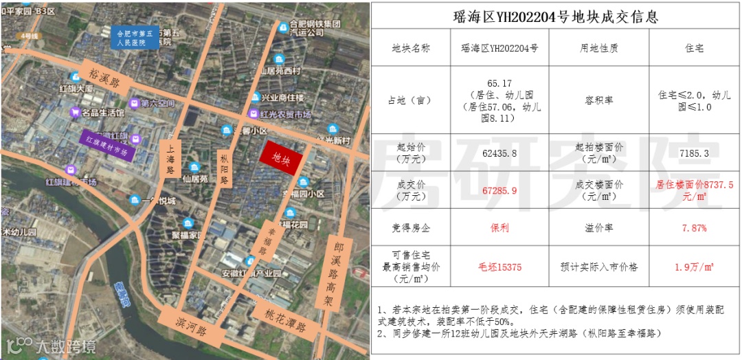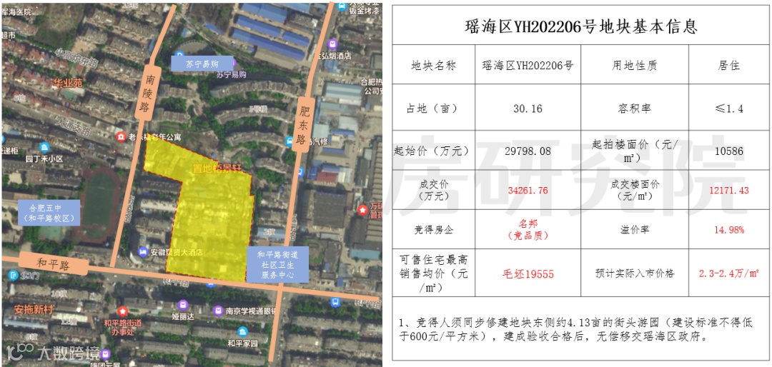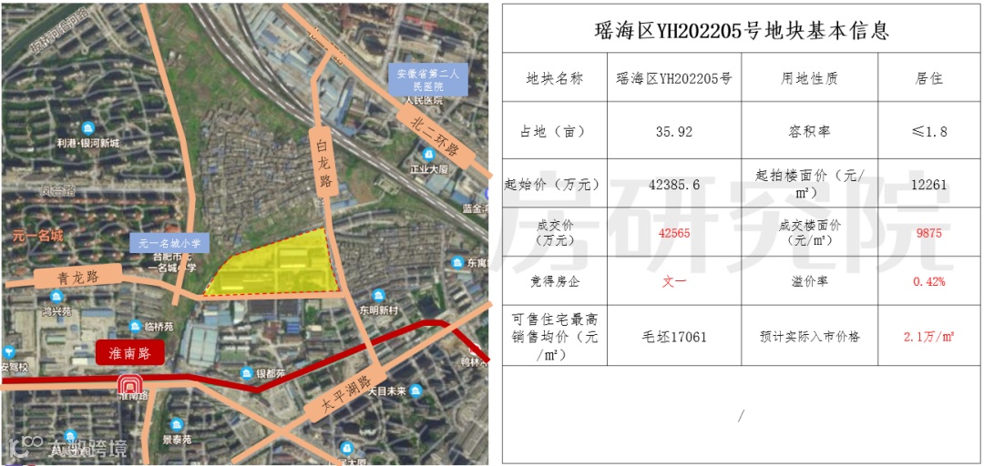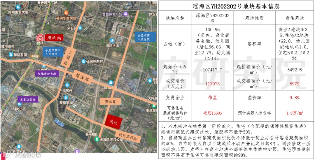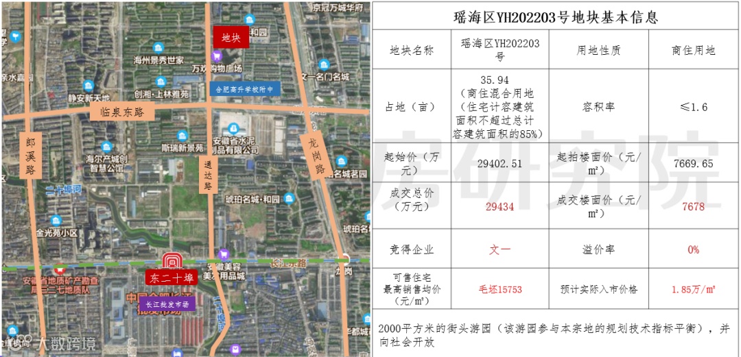 二环内老城核心地块,周边的居住成熟度及学区都具备一定的优势,须配建约4.13亩的街头游园,相比其它瑶海地块,该地块配建较少,因此最终成交楼面价也接近瑶海区的历史最高楼面价,达到12171元/㎡。该地块多家房企参与竞品质阶段,并由名邦满分摇号竞得。这也是瑶海今年最热门的一宗地。