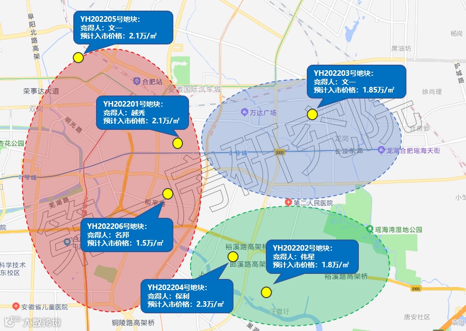 伟星在YH202202号地块转挂牌后竞得。地块自带约23亩商业、12亩幼儿园,且部分商业须自持8年,这导致YH202202号地块实际利润有所降低,因此地块热度较低,未进入竞品质阶段。该地块位于合肥东部新中心规划核心范围,周边规划良好,最终综合成交楼面价不足6000元/㎡。未来入市价格约1.8万元/㎡左右。