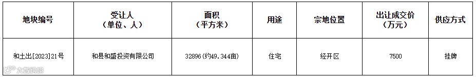 市天成拍卖有限公司,在和县公共资源交易中心举办国有建设用地使用权挂牌出让交易会,对和国土告字[2023]7号中1宗地块进行挂牌出让,现将出让结果公布如下: