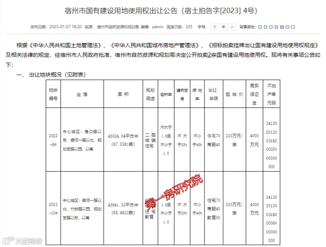 近日,宿州市政府公告出让两宗涉住地块,面积达到了136亩,两宗地块容积率均小于等于1.5。