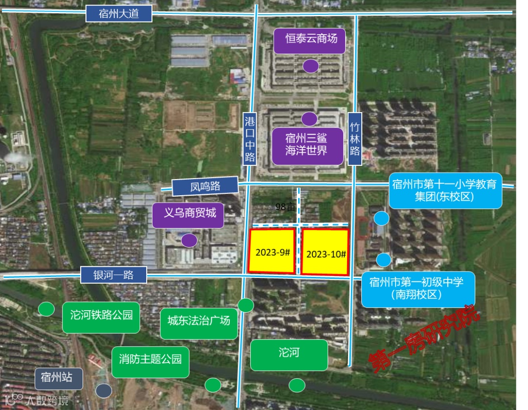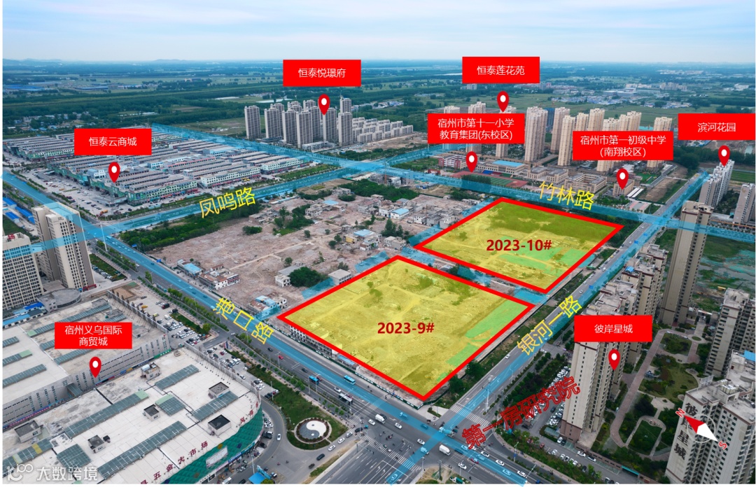 两宗地块均位于银河一路以北,其中2023-9号地块67.5亩、2023-10号地块68.5亩。地块四面临路,西侧港口路为南北向贯穿城区的主干道,同时,地块邻近宿州新火车站,交通出行之分便利。地块北侧紧邻宿州三鲨海洋世界、恒泰云商场,西侧紧邻义乌商贸城,生活休闲购物十分便捷。地块周边均为成熟社区,人气十分旺盛。地块东侧有宿州市第十一小学教育集团(东校区)、宿州市第一初级中学(南翔校区),优质教育资源突出。该地块位于城东新区,紧邻老城核心区,地段优质,可完美承接老城区外溢。