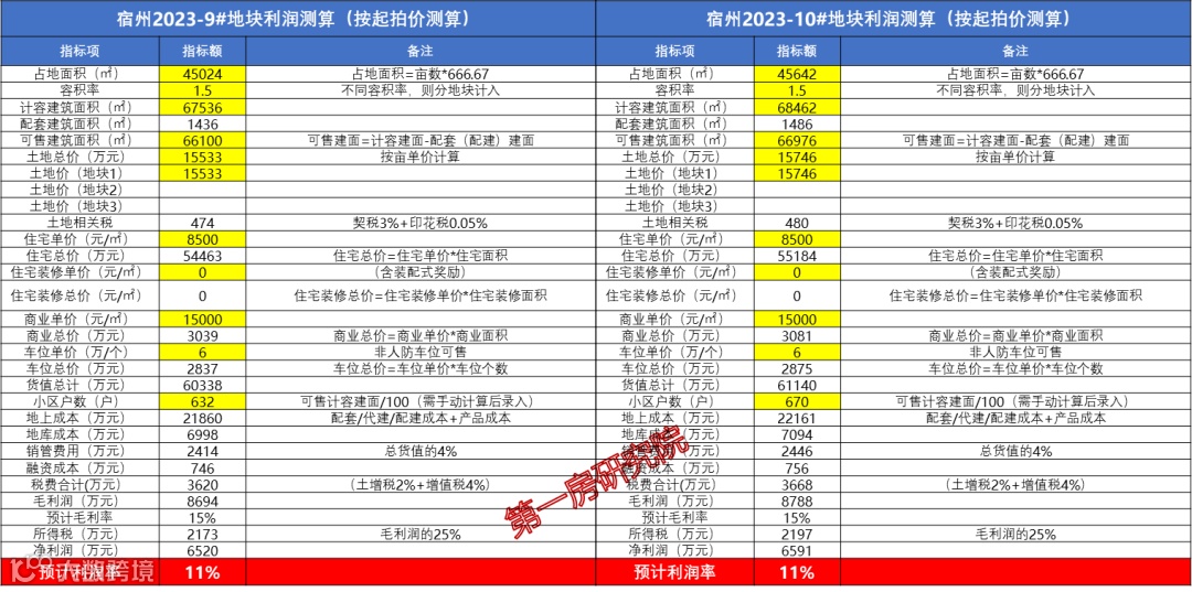再看测算,两宗地块的初始价利润率均超过10%,拥有一定的利润空间。