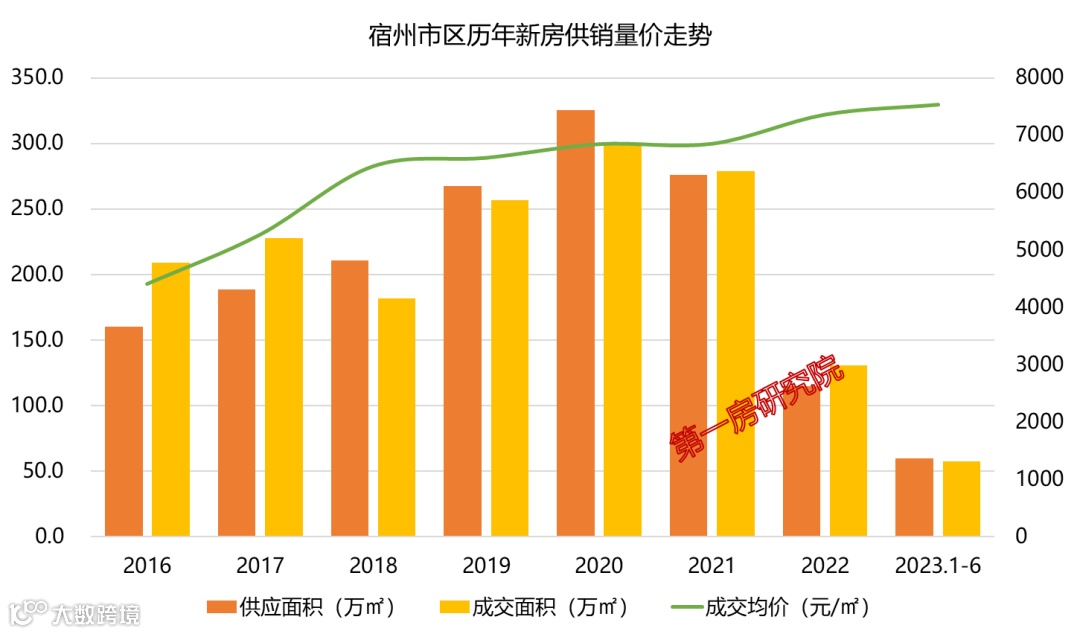 宿州近6年新房市场供求平衡几近平衡,成交均价稳中有升。市场供求关系相对健康,楼市调控政策及时,市场稳步上升。2023年上半年,市区批准预售住宅面积59.8万㎡,5038套;市区住宅备案57.5万㎡,4893套;住宅成交均价7537元/㎡。
