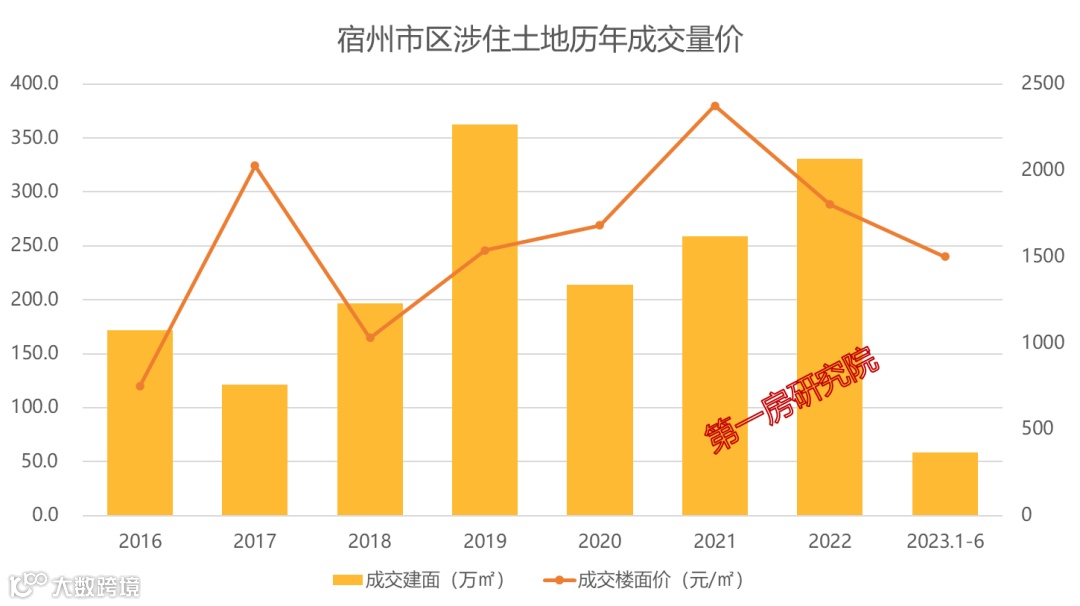 宿州2016-2022年年均土地成交住宅建面236.4万㎡,供地节奏掌握较好,基本平衡,处于去库存的状态。2023年1-6月市区供应7宗涉宅用地,成交7宗,成交建面达到58.5万㎡,楼面价为1501元/㎡。