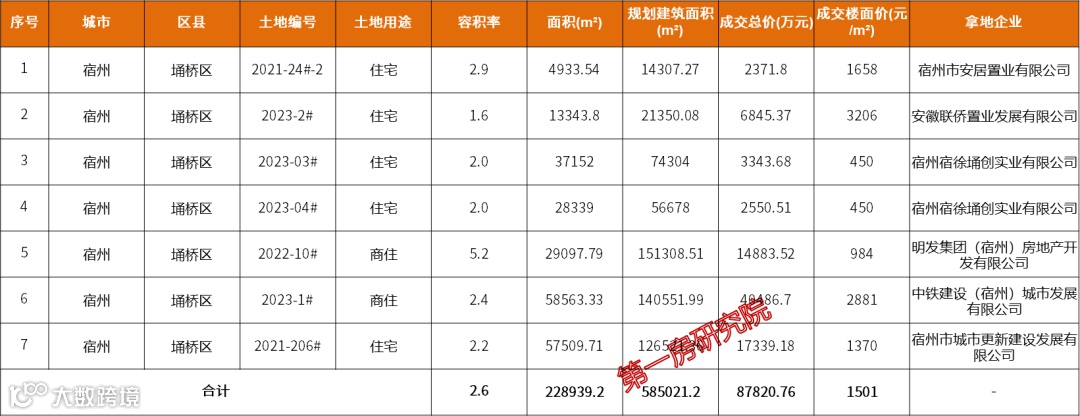2023年上半年宿州市区供应8宗,成交7宗,成交建面为58.5万㎡,楼面价达到了1501元/㎡。