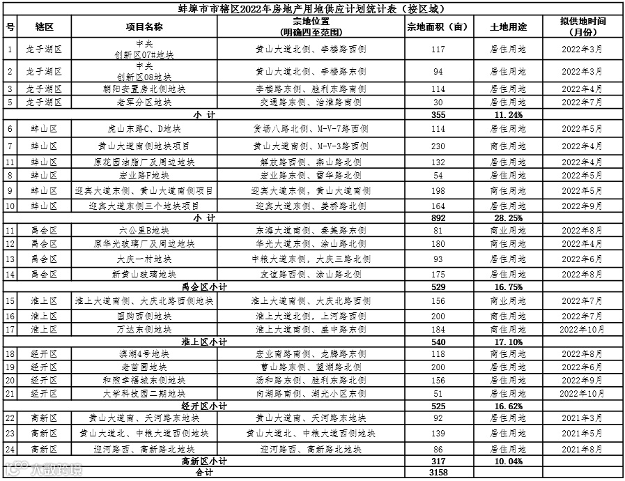蚌埠2022年市区国有建设用地计划编制总体思路为“总量平稳,保障重点”。根据前期对各区可出让房地产项目用地的摸底情况,蚌埠年初初步拟定市区计划供应各类土地共87宗 ,10645亩。