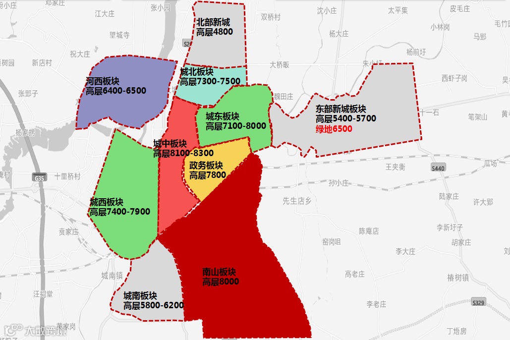 城市发展方向,靠近老城城东核心(政务)板块配套完善,客户认知较好;泛城东板块生活配套相对不足,客户认知相对较弱。