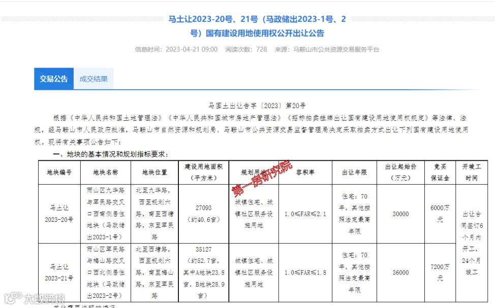 今年马鞍山市区共成交两宗地块,4月21日再上市两宗商住用地,面积约93.3亩,将于5月12日拍卖出让。