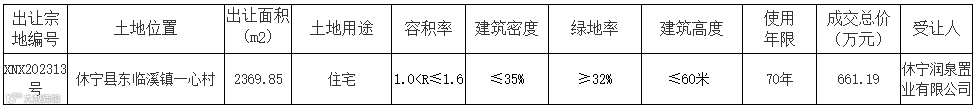 休宁润泉置业竞得1宗休宁县居住用地
