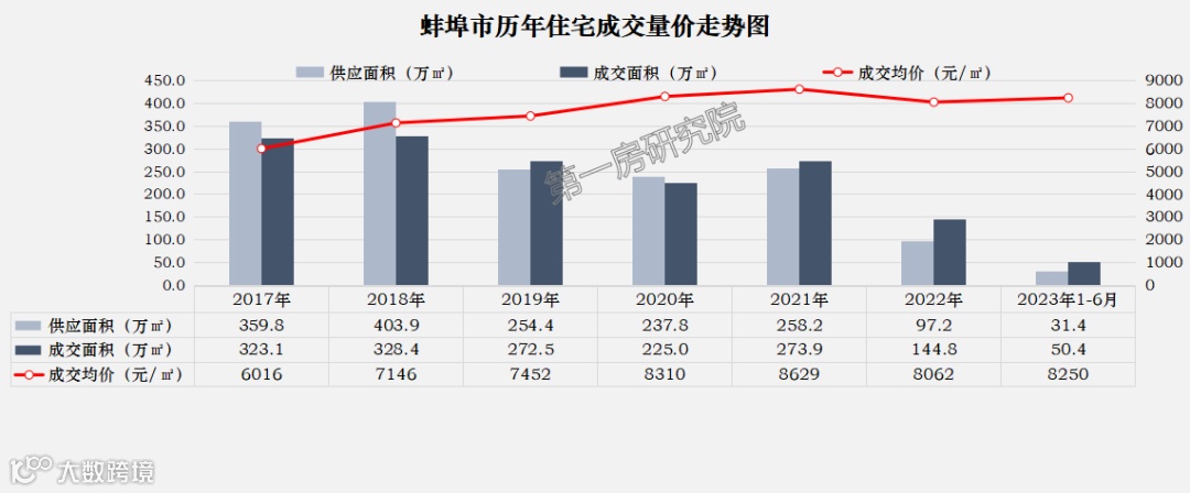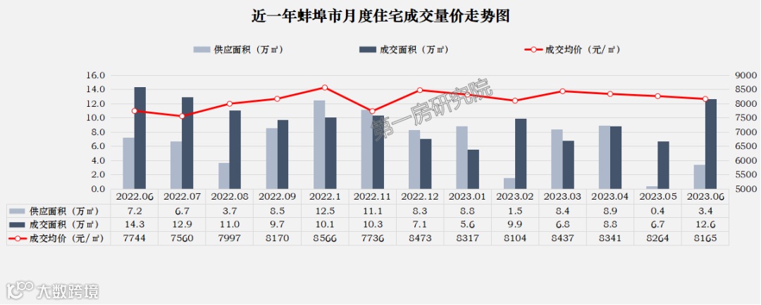 2023年6月蚌埠供应3.4万㎡,成交12.6万㎡,成交均价8165元/㎡,整体走势上扬。