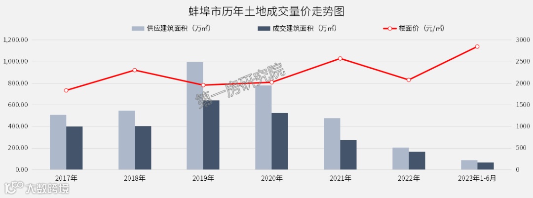 蚌埠近6年土地年均供应584.4万㎡,年均成交401.6万㎡,供应成交率69%,平均楼面价2088元/㎡。2023年1-6月蚌埠市成交6宗涉住地块,计容建面67.59万㎡,成交楼面价2850元/㎡。