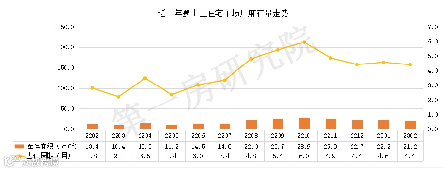 蜀山区整体土地成交较为稳定,供求处于平衡状态,当前存量21.2万方,去化周期4.4个月,房地产市场较为健康