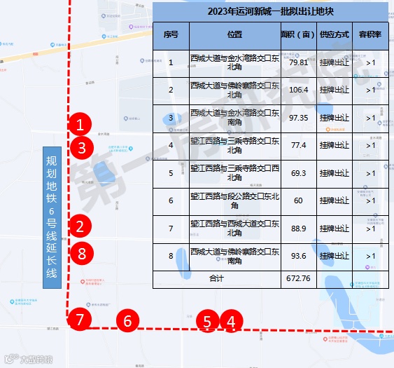 今年运河新城一批次拟供地8宗,合计面积672亩。从地块位置来看,都位于运河新城核心区域,沿地铁6号线延长线走势供地。