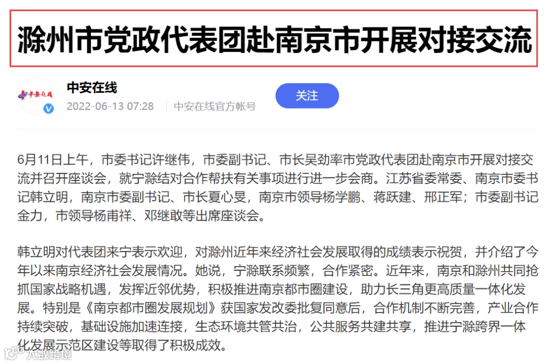 今年6月11日上午,滁州市党政代表团赴南京开展对接交流时,江苏省委常委、南京市委书记韩立明表示:宁滁联系频繁,合作紧密。近年来,南京和滁州共同抢抓国家战略机遇,发挥近邻优势,积极推进南京都市圈建设,助力长三角更高质量一体化发展。