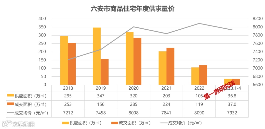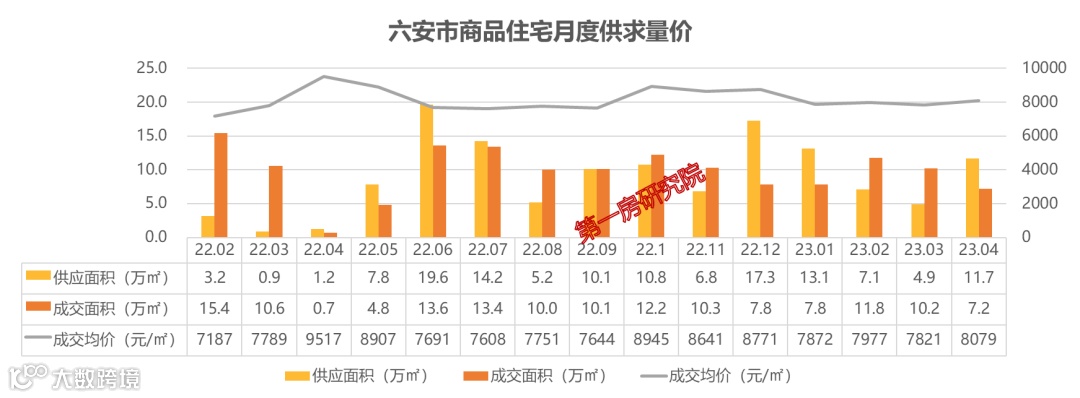 2023年4月六安市商品住宅供应11.7万㎡,销售面积7.2万㎡,成交均价8079元 /㎡,成交价环比微涨3%。