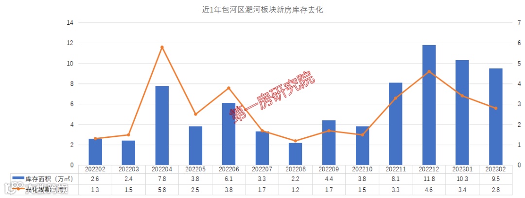 近一年淝河板块的新房库存出现翘尾上涨行情,截止到2月份,库存量为9.5万㎡,去化周期为2.8个月。