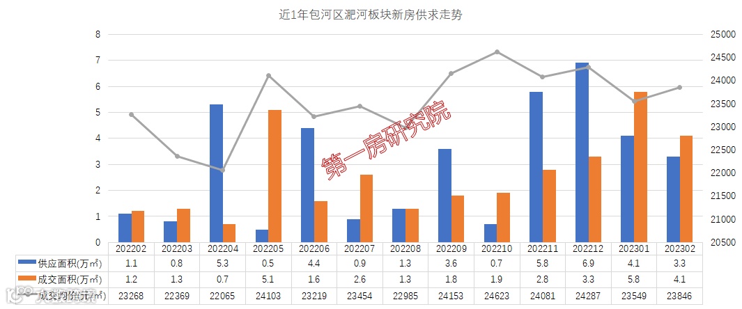 近一年淝河板块的成交量螺旋上涨,主要集中在5月、1月和2月,2023年3月板块供应3.3万㎡,成交4.1万㎡,成交均价达到23846元/㎡。