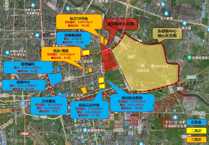 淝河板块目前在售及待售项目8个,其中6个在售盘,在售精装售价2.4-2.5万/平左右,其他2个均为待售楼盘,预计后期售价毛坯约2.3万/平,精装约2.4-2.5万/平。