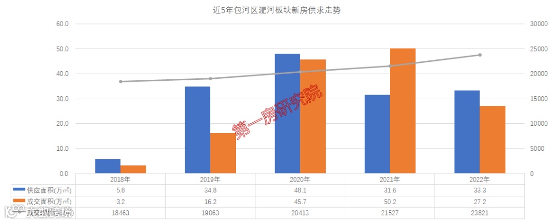 近5年淝河板块新房年均供应30.7万㎡,年均成交28.5万㎡,供大于求,板块均价稳定上涨,2022年已达23821元/㎡。
