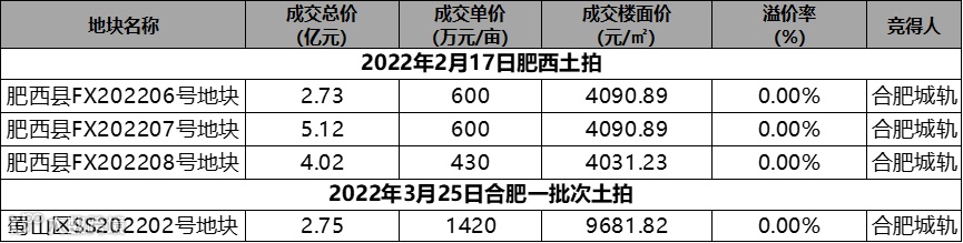 合肥城轨是合肥地方性国企,之前在合肥开发项目较少,大家比较熟悉的可能就是滨湖新区的九联湖畔项目,但是今年,合肥城轨明显加快了步伐,2022年2月17日肥西土拍,合肥城轨一口气拿下肥西县FX202206、FX202207、FX202208号三宗地块,3月25日,合肥城轨又拿下蜀山区SS202202号地块。其实,这些土地都有一些共同点,咱们接着往下看: