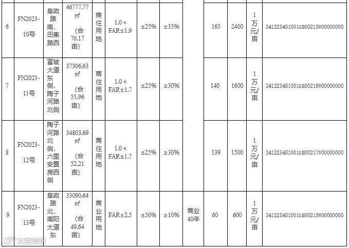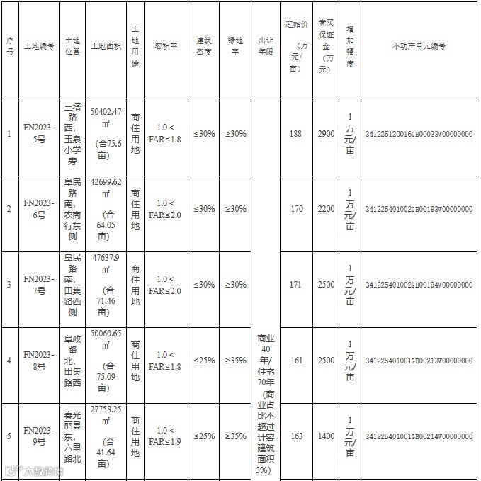 4.阜南县FN2023-5、6、7、8、9、10、11、12、13号九宗地须同时报名,同时报价,每次增价幅度相同,价高者得,在不低于底价情况下同时竞得。竞买人在参与竞买时,必须有1次(含1次)以上的应价或报价,且应价或报价应在起叫价之上,每次报价增幅不得低于宗地报价增幅,否则竞买保证金不予退还。