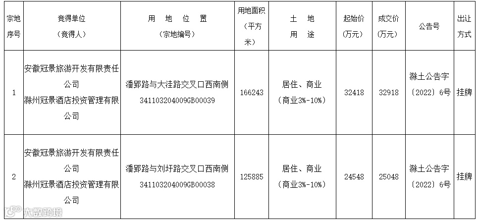 导读:2022年3月9日,滁州市自然资源和规划局在市公共资源交易中心公开挂牌出让2宗经营性用地,成交2宗。根据原国