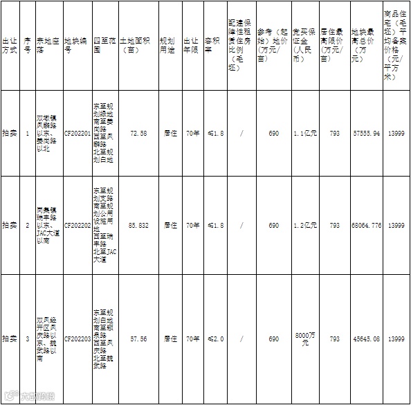长丰县CF202201号地块,位于双墩镇凤麟路以东、姜尚路以北,面积72.58亩,居住地块,容积率≤1.8,毛坯限价13999元/㎡。