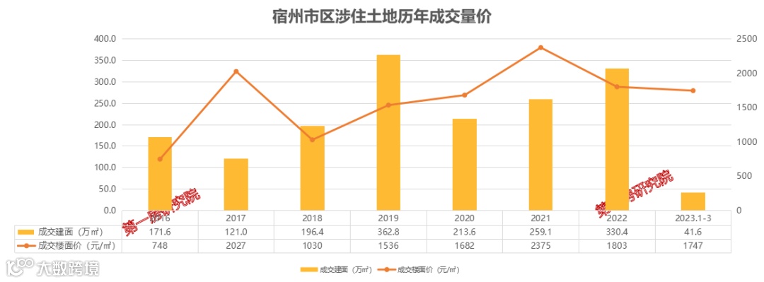 2016-2022年宿州年均土地成交住宅建面236.4万㎡,供地节奏掌握较好,基本平衡。